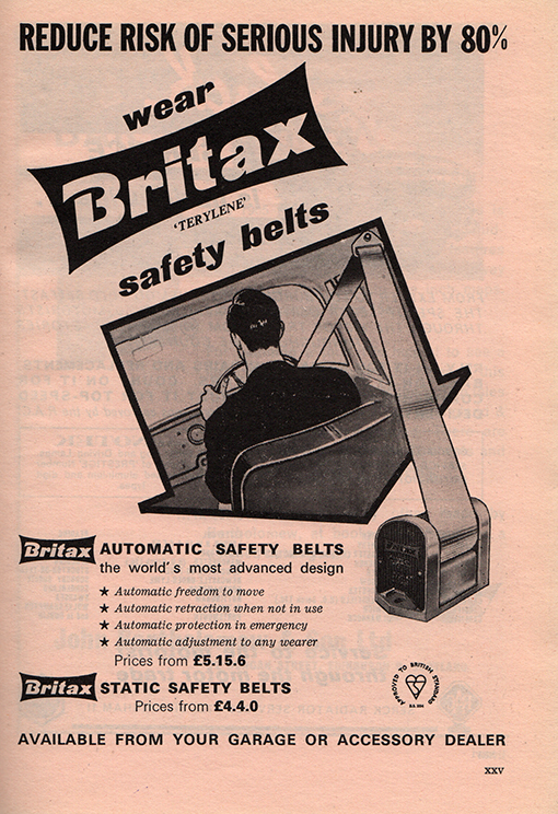 When my dad moved to the motor wholesalers in the early 60s, a major promotion was seat belts. Then new, then often lap only rather than lap or diagonal, often fixed rather than tightening on impact. He used to arrange promotional talks. I well recall assisting with one. It must have been 1964 or 1965. The five star Royal Bath Hotel in Bournemouth. The seat belt manufacturer who should be nameless (OK, it was Britax) had invited police from three forces to watch safety films on seat belts in the hotel. There was a free bar with beer and spirits … that’s how safety conscious they were in those days. I was 16 or 17 and allowed to partake. I can still see two senior police officers helping a stumbling very senior police officer to his Jaguar. The man was pissed paralytic, unable to speak, and they put his key in the ignition and started the car for him. He drove off into the night.