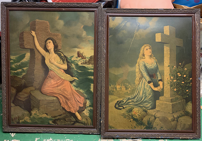 They came to mind clearing my father-in-laws house. We found two gloomy chromo lithographs in the attic that neither Karen nor her sister ever remembered seeing, both part of the popular 19th century Rock of Ages series. There are many on eBay. They combined religious fervour with busty damsels to enliven the church hall. Where did they come from? We remembered that her mum used to store the jumble for their local church in the 1960s. They must have been unsold rejects from that era. They’re now in our garage. I will ask a local amateur theatrical group if they want them.