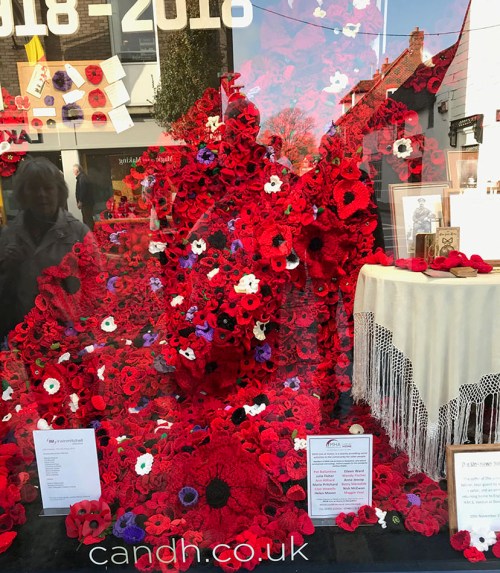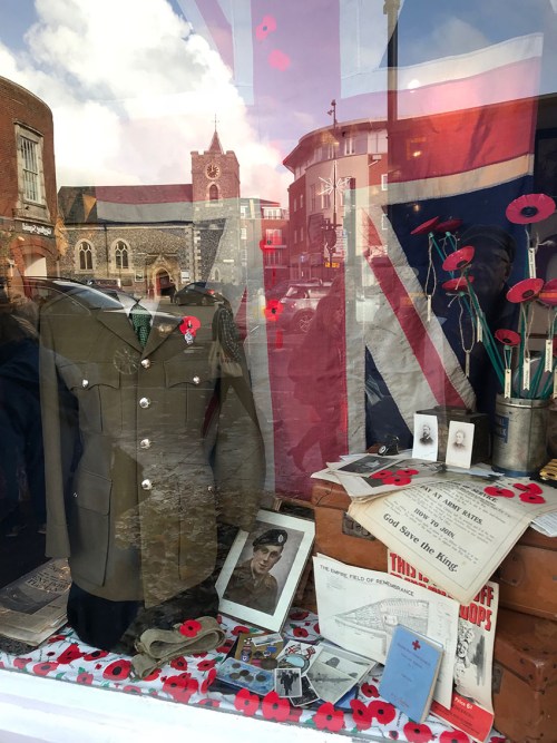 The commemoration over the week differed widely. Not much sign of it in the big towns, but we spent Friday in rural North Dorset … Sherbourne, Stalbridge, Sturminster Marshall, and it seemed that every shop had an elaborate display with poppies, uniforms, flags, photos, shell cases, wooden crosses, original letters. The streets of those small Dorset towns were festooned with flags. Hand-knitted poppies were everywhere. I guess in those more rural communities you can walk past the War Memorial and see your family’s names engraved there. There’s a continuity that’s lacking in large towns and cities. Chichester’s not a small town, but there was a lot there on Saturday too.
