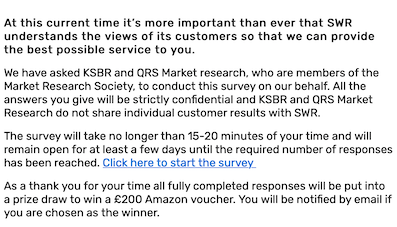 So to the supermarket. Would I like the chance to win a £5 shopping voucher by taking part in our online survey? No, not really. Then on to the next supermarket …