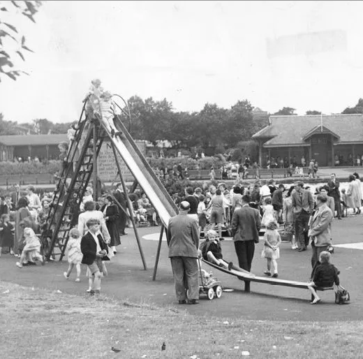 The ground would be rough concrete with sharp stones sticking out. If you didn’t get a bad cut or abrasion there you hadn’t lived. The slide was way above modern height, probably 20 feet high, with a dangerously low hand-rail on the steep steps. There’d be a dozen kids queuing and jostling on the steps, so if fear overtook you near the top, there was no way they were all going to descend backwards to let you off. Going down in pairs or backwards was encouraged. In summer the aluminium surface of the slide would be hot enough to fry an egg on in 30 seconds, so it was fortunate that it was steep enough to propel you at high speed. The slide ended by tipping you on the rough concrete. Boys wore shorts and girls tucked skirts into navy knickers because scarred knees were a cheaper option than darning clothes. Tarmac? Luxury! A rubberised surface or soft wood chips? Thirty years in the future.