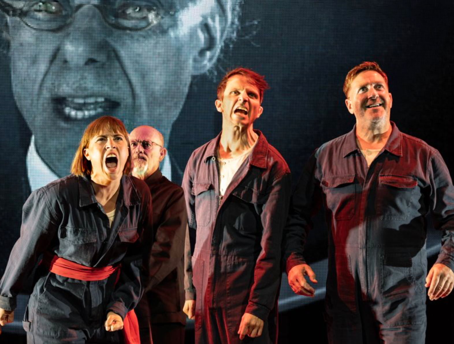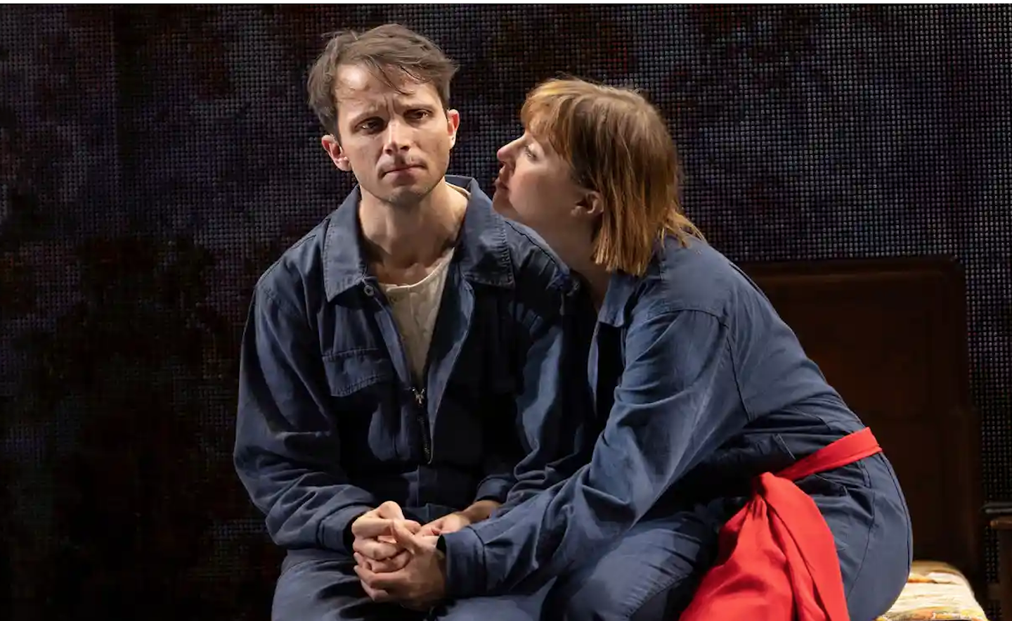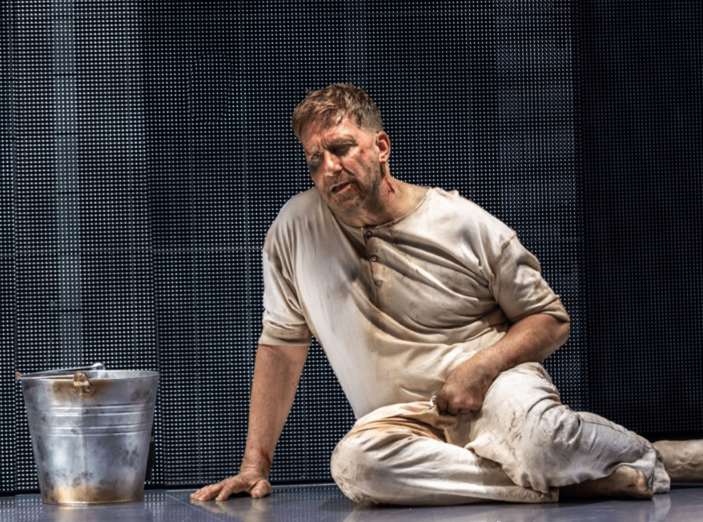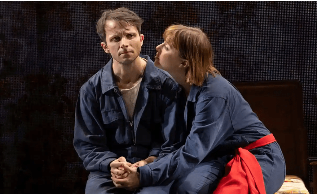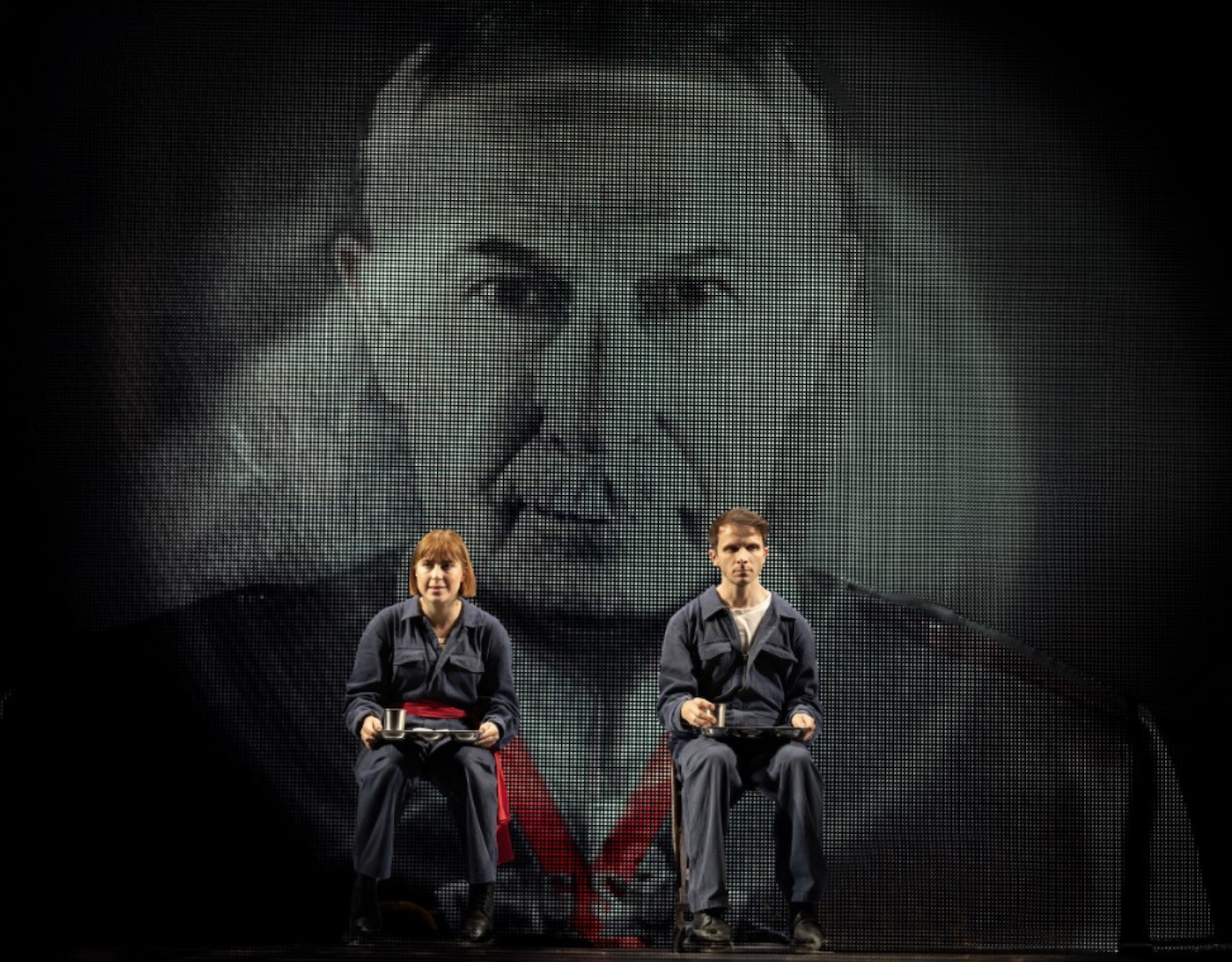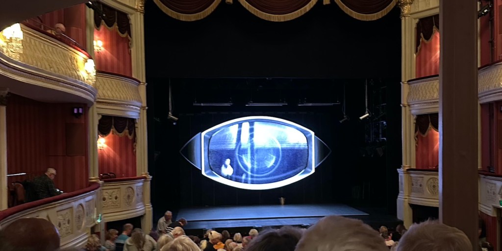 The technology was visually good + +. The sound design and recording was good + +. Unfortunately, the sound execution was poor minus minus. This was the issue. The TV screen actors were loud and clear, at a much higher volume than the stage actors. When you had Winston and TV, the contrast in levels was too great. Yet David Birrel as Parsons and Keith Allen as O’Brien were loud enough to work against the recorded level behind them. Eleanor Wyld was in the early scenes. Mark Quartely definitely wasn’t. When you had two live actors, in general we could adjust to that volume level. In general, but in the last Chestnut Cafe scene, both Winston and Julia were under-projecting. Two live actors? Usually fine. Actor plus TV voice? Problems. Was it our position? We always used to sit in the front row of the Royal Circle, but the lack of legroom moved us three or four rows back so you have a fairly low ceiling above you. That impacts on sound and we’ve noted it before (we decided to book front row of the circle or stalls again in 2025), but then the sound engineer was in the Royal Circle too, at the back, potentially the weakest spot. That’s the right place to be. However, it’s a tricky sound plot, constantly changing, so he had headphones on throughout. A music engineer would definitely take them off briefly to hear the ambient sound. If you do that, you’d know Mark Quartely was often too quiet – certainly not too quiet in the torture scenes. We felt he’d been told to do depressed, blank, and you can’t do that and be loud. I feel awful criticizing him as otherwise it was an incredible + + acting performance. I’m fairly sure the actors didn’t have head mics … after all when Winston was naked there was no where to hide one. Perhaps they should use them.