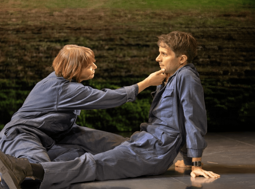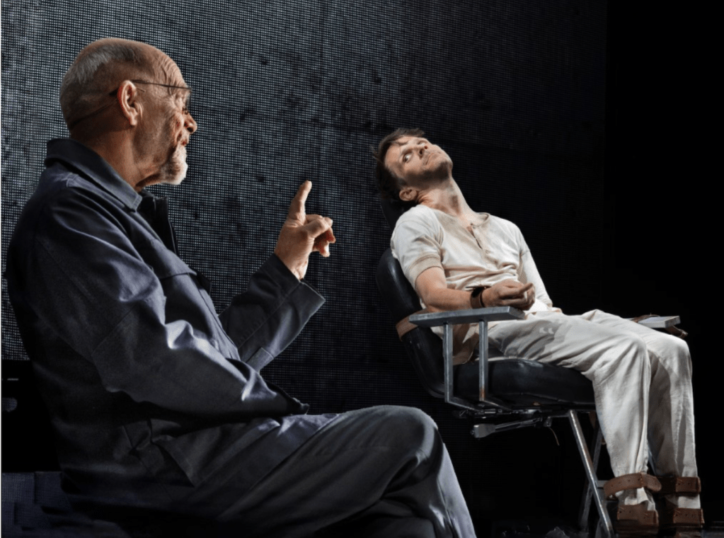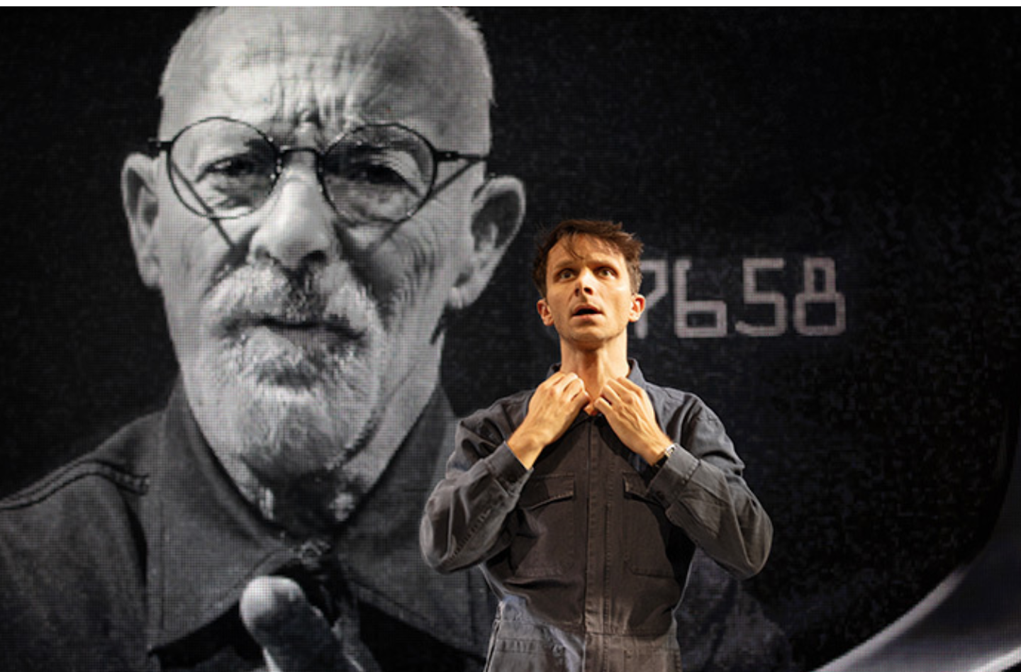 Then the TV screen is used extensively for pre-recorded segments from well-known actors as Newscaster, Ampleforth, Big Brother, Medic etc. A projected screen is used for sets – the TV screen, the golden woods, the cell, Winston Smith’s room, the safe house flat. We see a back set behind the screen (which becomes transparent) of wrecked buildings for his childhood home and Mr Charrington’s Antique Shop (Mr Charrington does not appear). We see his mother back there, but his sister looks like a moving hologram. OK, the technology is there, not least for ABBA at the O2, but the RSC used it for The Tempest. I’m amazed they can tour it. Also, if I had the technology, I’m amazed at the restraint of using it once. It might just be film. Technically, all this is superb … uh, good plus plus. I liked the way the epic length and story complexity worked with many short scenes (I thought it failed in Birdsong recently).