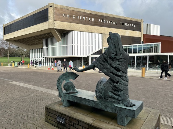 The attraction for us was not the many awards it’s garnered, but ‘Directed by Matthew Dunster.’ That was enough to want to see it. It’s on a never-ending tour and we could have seen it in several locations. There are sixteen more theatres after Chichester. A week in each. Chichester is the best physical space, though there is a downside. Touring productions have to perch their platformed set on the vast semi-circular stage, and because of the way it is angled, they did not sell the seats stage left of the set. You wouldn’t have been able to see into the ‘box’ of the set. The rest of the theatre was packed, so there was a loss in ticket sales. It also pushes the actors away from the audience.