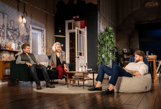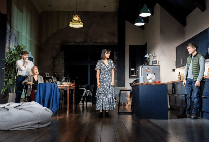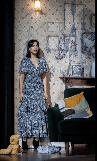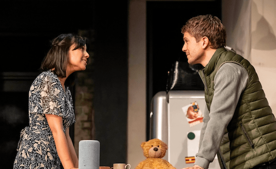 It won awards for sound design. There is a lot – baby alarm with sounds, footsteps upstairs, Alexa switched on and off, foxes howling outside, thunder and lightning, plus the loud effects at time shifts. Everyone has head mics. Again, there’s a minor downside, which is a constant low but audible throbbing buzz, mildly irritating for me, much more irritating for Karen, who wears hearing aids, but in the front row had no need of the theatre loop system. There’s probably just too much ‘live’ in the system. Light feedback? So no, I would praise the sound design’s complexity and timing of its operators, but overall it’s not state of the art.