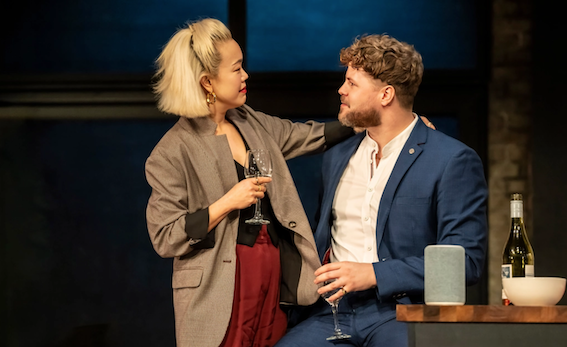 It won awards for sound design. There is a lot – baby alarm with sounds, footsteps upstairs, Alexa switched on and off, foxes howling outside, thunder and lightning, plus the loud effects at time shifts. Everyone has head mics. Again, there’s a minor downside, which is a constant low but audible throbbing buzz, mildly irritating for me, much more irritating for Karen, who wears hearing aids, but in the front row had no need of the theatre loop system. There’s probably just too much ‘live’ in the system. Light feedback? So no, I would praise the sound design’s complexity and timing of its operators, but overall it’s not state of the art.