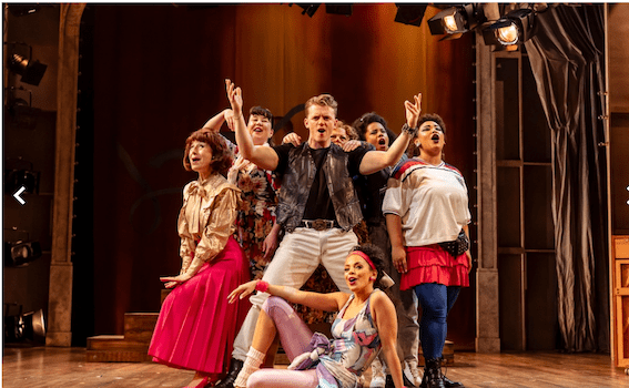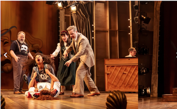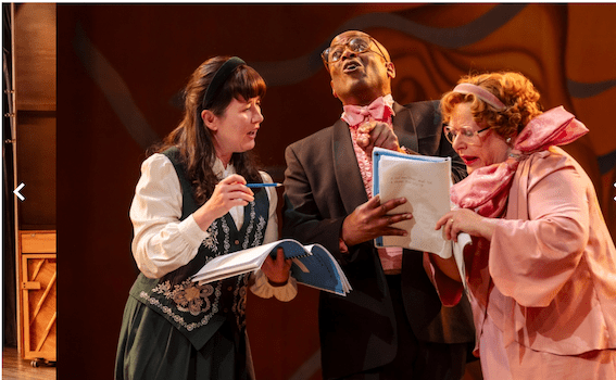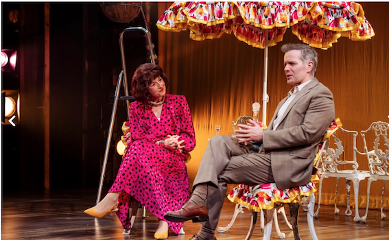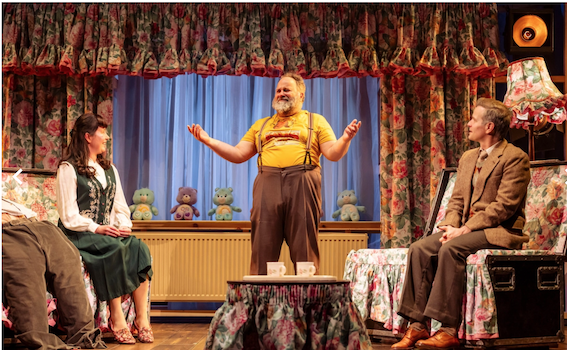 The set design is a star, changing constantly, so we are backstage, front stage, in a pub, the director’s house, the wife swapping couples house, the town councillor’s garden. It’s also a “green” stage set, recycling elements from other productions. That’s good, and fortunately they do NOT follow The Globe’s approach a few years ago, ‘Pick any costume you want from the costume store.’ The costumes are carefully thought out and paired so we see the couples. At the most obvious level it’s Ted and Enid Washbrook, the sweet older couple. (Lloyd Notice and Heather Williams). They have elaborate identical cardigans. Then they double up on the joke with matching duffle coats with patterned inserts, then treble up when they’re due to go to a dinner and dance and Ted’s frilly pink dress shirt matches Enid’s pink frock.