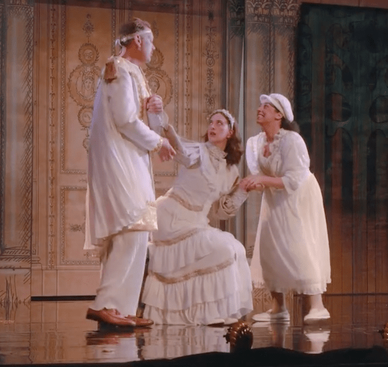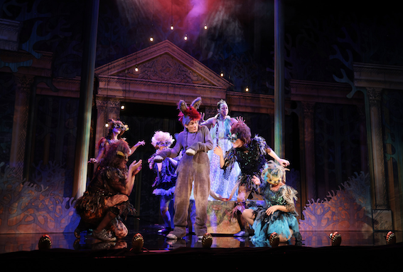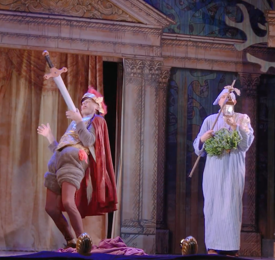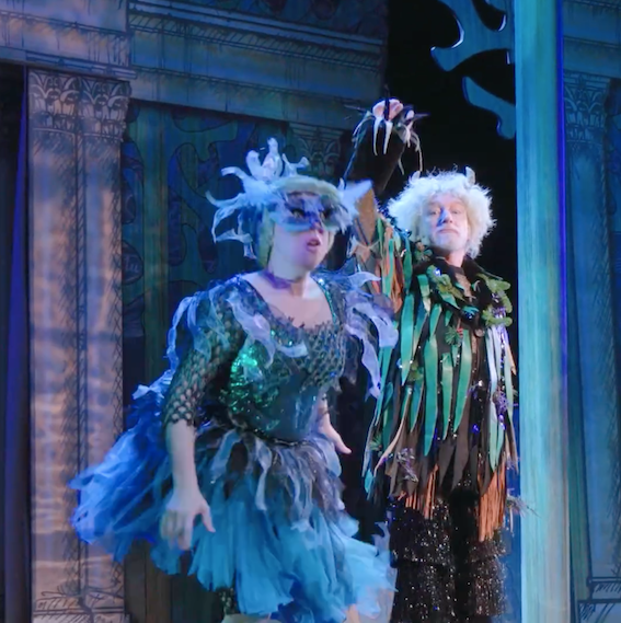 Costume is extreme. It leans to pantomime, but why not? At least it’s something strong and bright. There is a concept. The Athenians are all dressed in white (except Egeus in pale blue, some with gold bits, and in invented garb that never existed, though perhaps Byzantine almost describes it. For a change, the important lines from Oberon to Puck about recognizing them by their Athenian garments work. So often it’s just ignored in productions. Puck is covered with fronds and has Pan horns on his head. The faeries are similar. The Oberon costume is perhaps unflattering around the stomach though. The mechanicals are in modern dress … well, modern dress-ish.