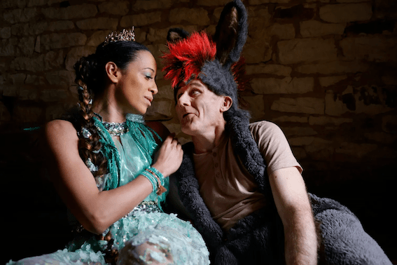 Tweedy (Bottom) and Jeremy Stockwell (Puck) come together with this from Cheltenham pantomimes, and played Vladimir and Estragon in Waiting for Godot at The Everyman. Tweedy, playing Bottom, is a clown. As in circus style professional clown. I think William Shakespeare would have approved as characters were indeed labelled ‘clown.’ The one review I read before said it’s a vehicle for him. I disagree. It’s an idea to allow the extremely rapid costume changes. He has solo wordless clowning pieces throughout, each riffing off a famous line. To be or not to be, becomes To bee or not to bee, with a bee routine. Once more unto the beach! is the classic clown deckchair routine. Yes, I’ve seen versions before but not for decades (I’ve even done lights on it in variety show days). The execution is sublime and more physical even than usual. The best My kingdom for a horse! is the third, and had me in tears of laughter. These silent pieces are essential to allow the concept to operate. Shakespeare’s clowns would have improvised lines. They would have added business.