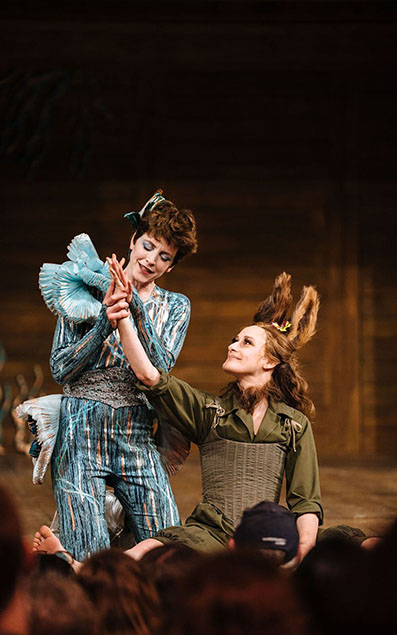 Just looking at the cast list, an unusual choice is having one actor doing Theseus and Oberon, then having two actors for Hippolyta and Titania. Since Peter Brooks realized that they never appear together so the fairy queen and king are dream projections of Theseus and Hippolyta, the vast majority of productions (though not all) have two actors for the four roles. Brooks had also worked out that was what Shakespeare’s theatre would have done. Jack Laskey also changes appearance and age dramatically for Theseus and Oberon, and Marianne Oldham is not only Titania, but Robin Starveling. I had expected Anne Odeke, who leads the fierce charging opening dance to present us with the angry captured Hippolyta, Queen of the Amazons, wooed by the sword (which is how Michelle Terry played it at the Globe ten years ago). She seemed more lovey dovey.