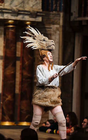For us, there is always the question of can they possibly find new business in the Pyramus & Thisbe play. We’ve seen so many. The lovers and newlyweds look down from the balcony, a Globe advantage. This version adds good costume (the lion looks hilarious, as does the Moon.)