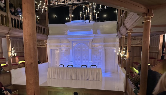 It is candlelit, but the entire Wanamaker stage has gone white. I can’t believe they painted over the woodwork, and can only assume a replica set sitting on top of the fabric of the building. It is touring after the Wanamaker so hopefully that’s the set they can move around with them.