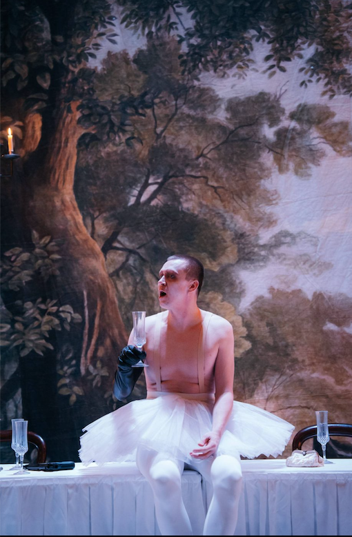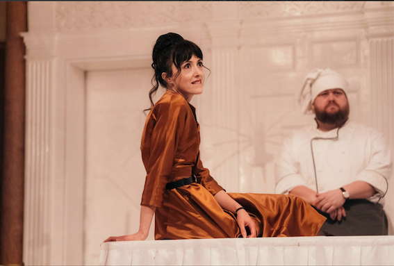 So it opens with Puck (Sergo Vares), in tutu and tail coat coming on, sitting on the table and slowly and thoughtfully eating a banana, before doing an opening speech (from elsewhere). Then a cast of uniformed servers (Downton Abbey style) set the table, before the Executive Chef places a suckling pig on the table.