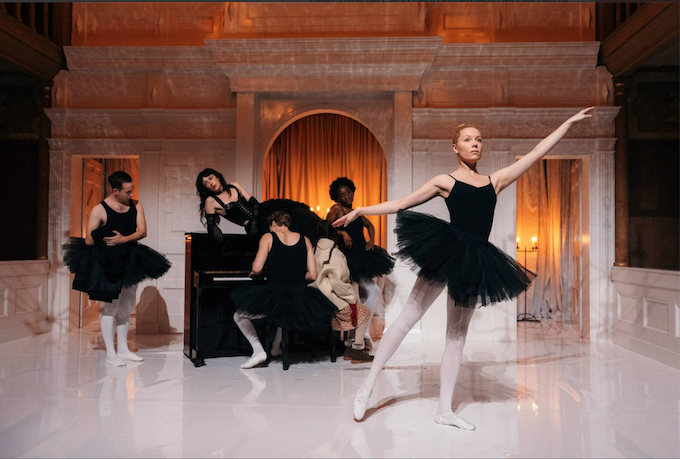 The fairies are in black tutus (everyone doubling) though we have two specialist fairies and Dannie Harris as ‘fairy / cover’ deserves a rather better credit as it must be her who does the proper ballet dancer on points `at the centre of the balletic scenes. Titania’s bower is the top of a glossy black piano, which Lou Jackson plays and sings to in fairy scenes.