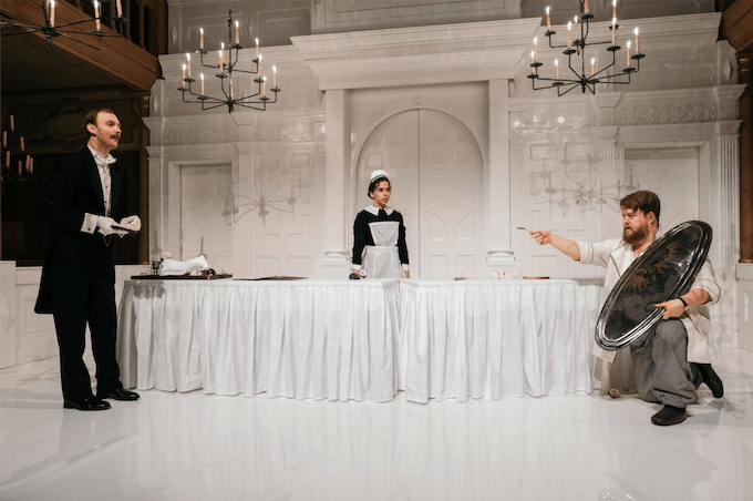 There are only three rude mechanicals. Bottom is the executive chef (Danny Kirrane) and Pria Kalsi is the waitress, Flute, as well as the Indian child. Jack Humphrey doubles as Egeus and Quince, though Quince is now the head waiter role, and in Act V, Bottom gets some of his lines.