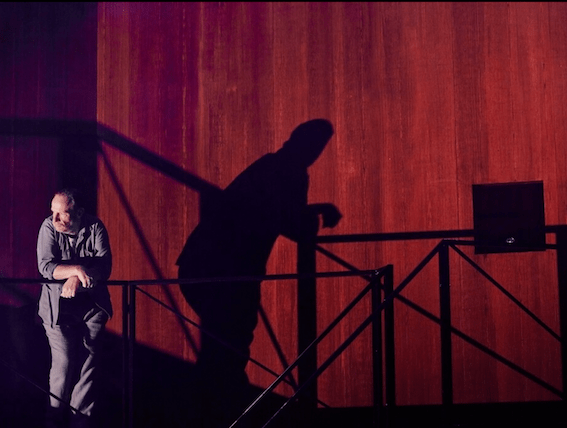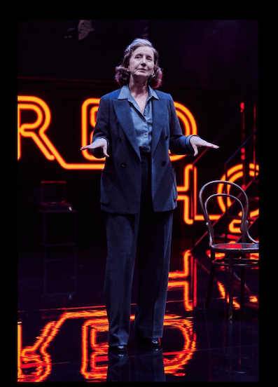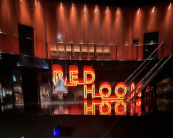 The set first. It’s shiny glossy black on the stage, with metal stairs to a platform with a row of eight cinema style seats (only two get used at the same time). That works well, and Alfieri gets to sit in various areas. Characters may be on stage when there not part of a scene. What is odd is a huge neon scarlet RED HOOK sign dominating the stage which is reflected on the floor. The photo is before the start. There is no yellow visible from the eyes, just red, but the camera picks up yellow. We both tried it.