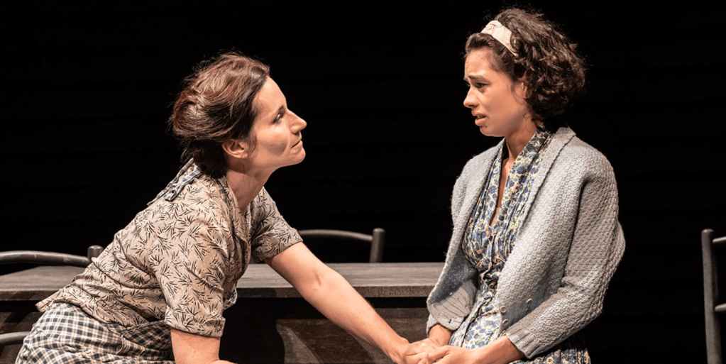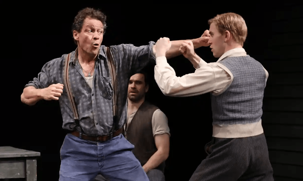 I remember an interview with Dominic West on his years in The Wire. he said he went into an American accent as soon as he landed in the USA to film each season, and maintained it on and off set until he left. He was totally accepted among the cast as ‘an American.’ That’s a major boost for Eddie Carbone. Not an accent issue throughout (a rarity). That goes to the other cast members too. We were talking about it with people in the interval. West was acting Eddie Carbone from his hair follicles to his toenails. He totally inhabited the role, and that’s before we even see the rage in part two. He looks a tough guy. He looks like a longshoreman. He even looks Italian-American. This is CarbonAY, not the later CarBONE. My only consideration was that he was taller than Marco, so looked tougher, though this Marco exudes enough determination to compensate.