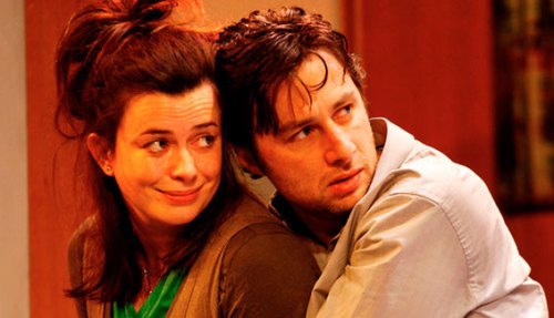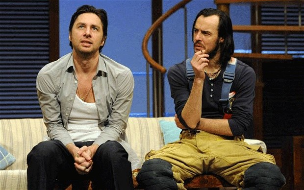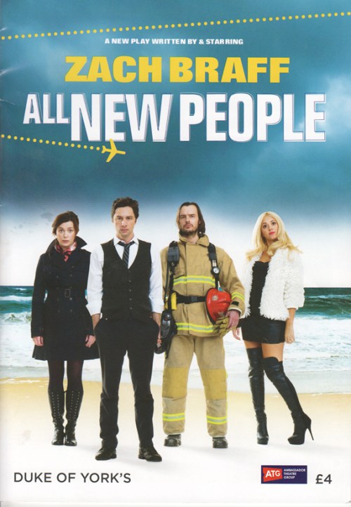 Zach Braff’s All New People opened as off-Broadway without him playing the main role. The writer as lead actor in theitr own play is a rarity – Neil LaButte, and of course Noel Coward are others. In London, he’s the main role, and has surrounded himself with three first-rate English thespians, two of them playing Americans (and very well).