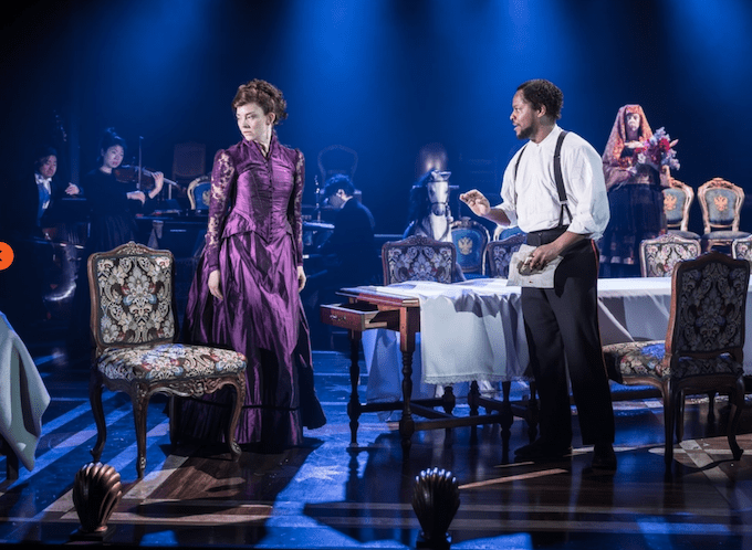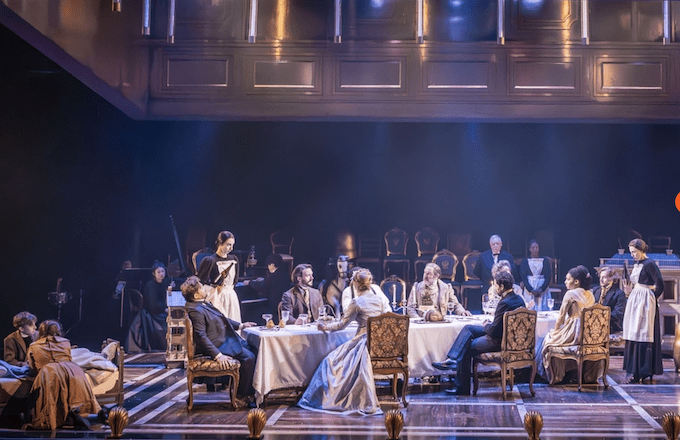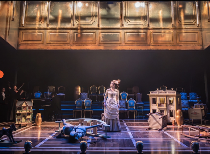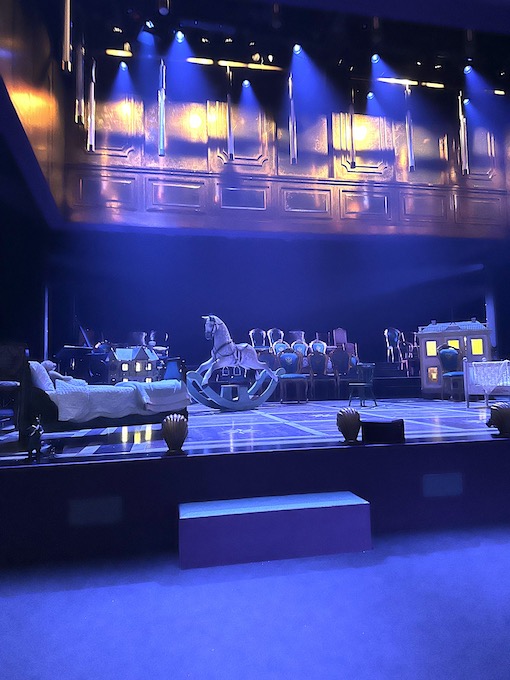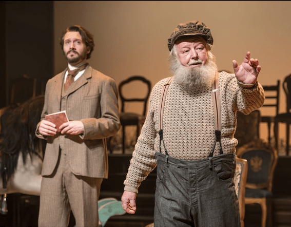 Here it’s like a children’s nursery with dolls houses, a cot, rocking horses in part one. When we move to Levin’s country estate, the black back wall drops to reveal an orange sky. The stage loses its usual half moon front, so has an acting area flat with the auditorium which is used. We were in the front row (I went to this one early on Theatre Friends Booking online) and I was terrified of extending my feet for fear of tripping cast members in the blackouts. They make much use of the two entrances / exits in the auditorium, which means it’s very much like the Royal Shakespeare Theatre lay out.