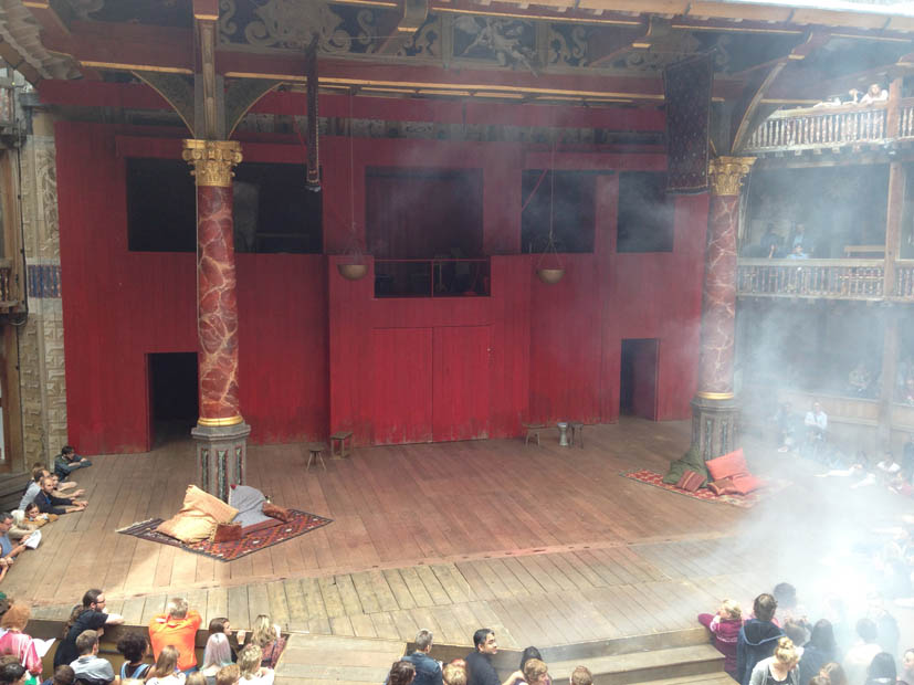 The Globe was set up quite differently. The whole of the back wall was covered with red planks, including the interior of the musician’s galleries. The curtained back centre entrance was replaced by red wooden doors (kept closed apart from entrances). The triangular thrust section was gone, replaced by steps, with two wide ramps leading up to the sides of the stage (making it rather more like Stratford in effect). Large backcloths were used … dark blue SPQR for Rome, a tattered map of the ancient world for the battles section. Incense wafted around before the start. Music played through several scenes … drums for action, cello for tragedy.