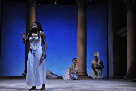 The start of the play is as stunning as any production I’ve seen. The lights dim on the set of simple pillars, and the lights slowly reveal that beyond them is a pool of water. Cleopatra has her back to us, sitting in the water. She stands, naked (well, the lights are low, but that’s certainly the impression), turns to the audience and her female attendants come to drape her with robes.