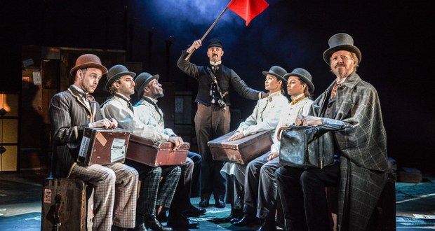 It’s full of outstanding physical theatre. They’re playing to a first rate sound design, and hitting the points with meticulous timing. The fight scenes, all conducted across with full width of the stage separating the participants, are some of the very best and funniest I have ever seen. There is a running joke with throwing passports and paper money (the huge £5 notes of the 19th century) across the stage. Much of it was developed in rehearsal, according to the programme. Everyone has to dance, fight, act and do circus acts. There’s a good five minutes with barely a word at the start, as we watch Phileas Fogg’s daily routine. It’s stylised and hilarious. Andrew Pollard is Phileas Fogg. In a brilliant ensemble cast, I;m sure none will mind me saying that Passepartoute, played by Michael Hugo is the star of the show.