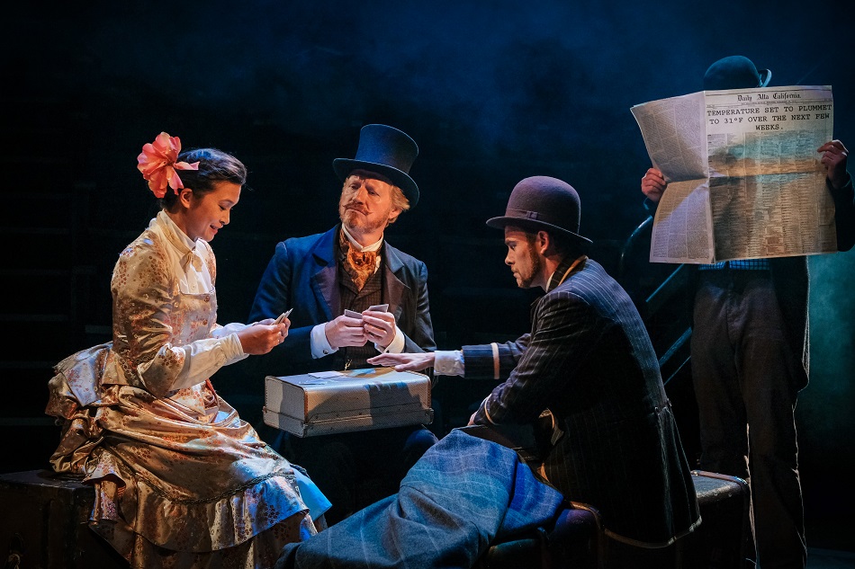 On the train from San Francisco: Kirsten Foster (Mrs Aouda), Phileas Fogg (Andrew Pollard), Passepartoute (Michael Hugo), Inspector Fix behind the newspaper