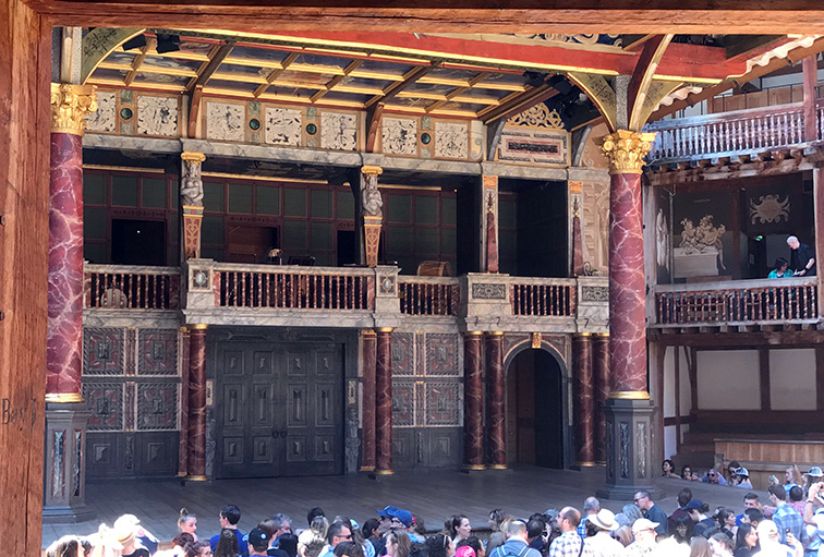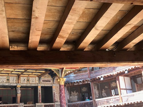 Unusual: a completely unadorned Globe stage. Back to basics.