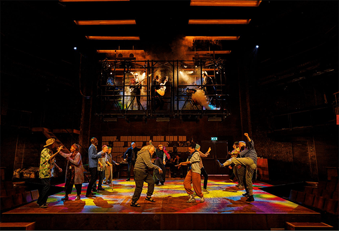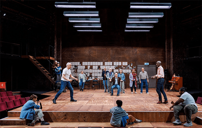 The cast drift on, chatting to the audience. The stage is brightly lit by overhead panels (much like our kitchen or any rehearsal room). That spills over into a lit audience early on. Dynamic lighting only arrives in the second half, though spotlights are used for speeches on the walkways.