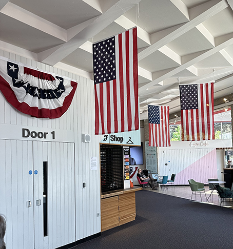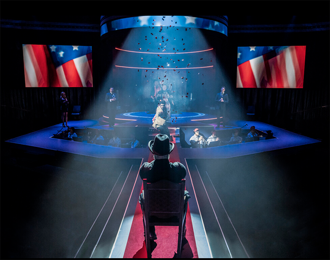 Chichester goes to town with lobby decoration setting the tone, flags, garlands, staff in baseball caps, popcorn. There’s a hot dog stall outside. The musicians are in red baseball caps and US flag ties too when we get in. The theatre space has been dramatically altered.