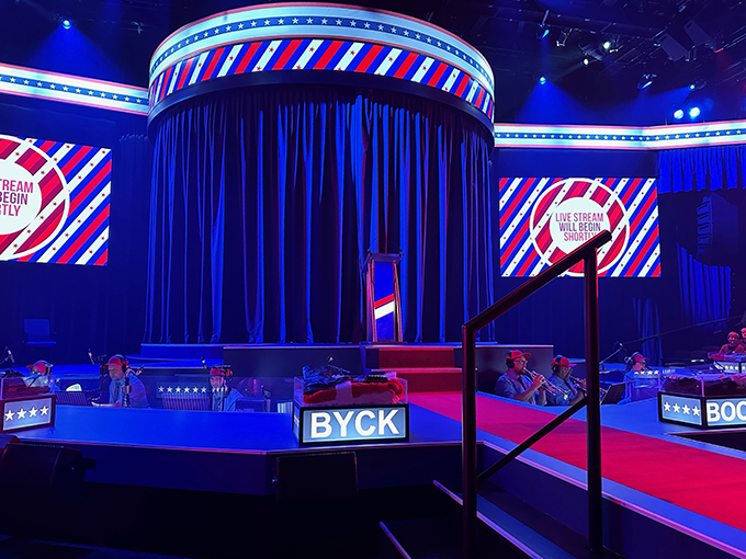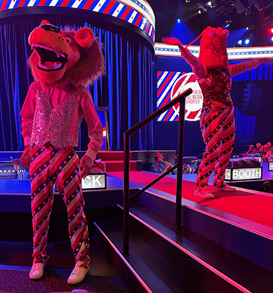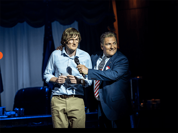 The “proprietor” or carny (Peter Forbes) has now become a tanned, smart-suited politician with stars ‘n’ stripes tie in presidential style. A “booster.”