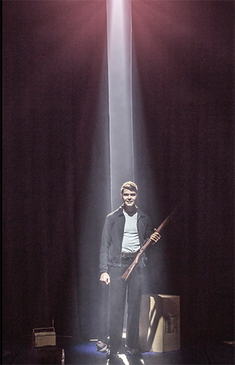 The characters we focus on are nine American assassins or would-be assassins. Eight are brought up from the audience in modern US street clothes, and invited to participate in ‘Shoot the Prez’. Each of the eight goes to their assigned lighted places, and at the end of the scene, they pick up the costume boxes placed there. Once the story commences and we see them in their historical roles, they are in the appropriate costumes and wigs. At the end, they return to street clothes / own hair.