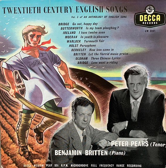 The thing is that opera is the only musical form that I dislike. The second is there are strong aspects of Benjamin Britten I can’t stand, namely the records with Britten on piano with Peter Pears visiting English folk song with his Advanced RP tenor. Can’t stand, as I’d rather hear nails scraping down a blackboard. I bought this LP for £1 for the cover illustration. It is ‘not to my taste’, including the piano playing. Later folk singers like Ewan MacColl railed against piano in folk music, probably because of things like Britten and Pears and the BBC singing programmes broadcast to junior schools in similar style. MacColl was somewhat unfair as most 19th century pubs would have had piano singsongs, which might be true folk music. But I know what he meant.