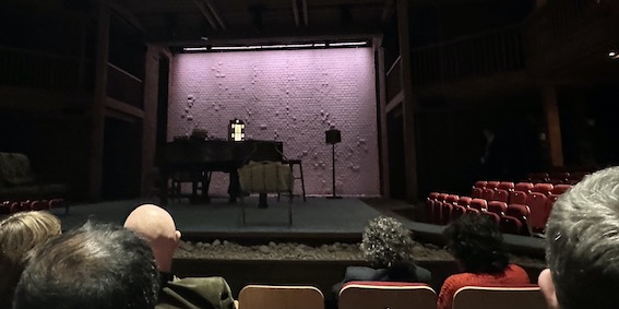 The obvious point is that this audience would have filled a studio theatre. It has a cast of two and one pianist. This is a studio play. It is in fact a radio play blown up in scope. It is dwarfed by the thrust stage and galleries. The really bad idea was putting it in the Swan rather than the RSC’s The Other Place, just along the road. It would have benefitted from the stage at (e.g.) Bath Ustinov, large enough for the play but with a small intimate audience. It would have been full too, and given the cast size, Bath would have sold it at half the price. I can tell you from experience, that talking to 120 people in a full hall with 120 seats is exciting. Talking to 120 in a hall for 450 feels flat.