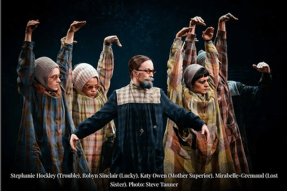 As soon as the three women … Treasure and her daughters, Trouble, and Lucky, drop their chequered nun’s costumes (those costumes don’t work either- straight nun’s habits would have been better) and start moving in unison, dancing and singing, it’s on its way. Robyn Sinclair is Lucky, the one who marries Blue Beard, and she has performed with the Watermill, and we’ve seen her. She has charisma.