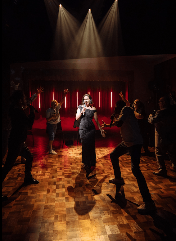 The setting is a room above a pub. A church hall or community centre feels more likely, but then the function room above a pub allows the cast to go down and get drinks. Large old pubs have such spaces. It uses the thrust stage with a fixed backdrop – until the end of each act, when the backdrop goes and a circular platform is pushed out into the centre thrust stage.
