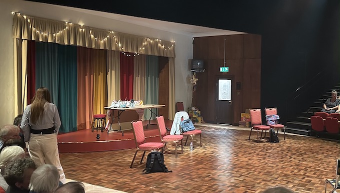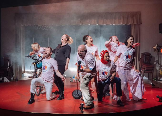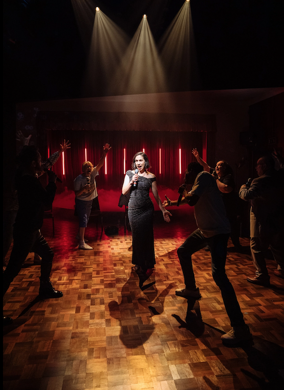 The setting is a room above a pub. A church hall or community centre feels more likely, but then the function room above a pub allows the cast to go down and get drinks. Large old pubs have such spaces. It uses the thrust stage with a fixed backdrop – until the end of each act, when the backdrop goes and a circular platform is pushed out into the centre thrust stage.