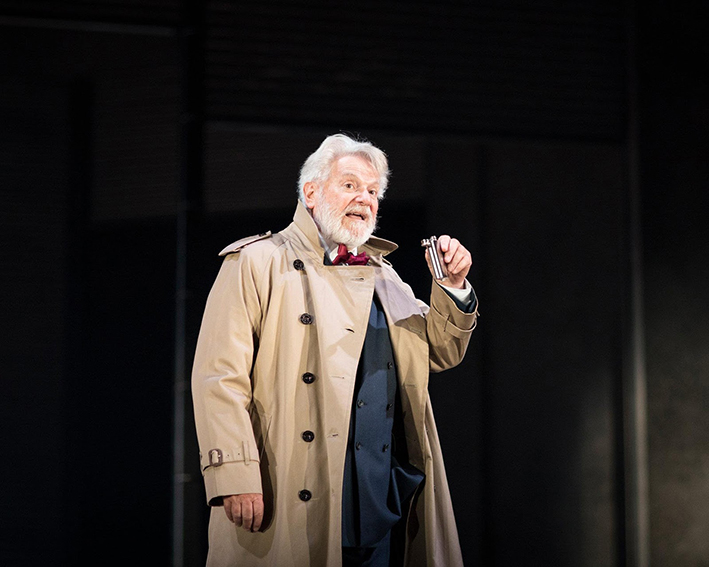 The play is vastly better after the interval, probably because we get less of the two Corbinista whingeing and plotting tribunes (here both female, which works fine), almost no mob, and we get much more of Aufidius (James Corrigan) and Volumnia (Haydn Gwynn), Coriolanus’s powerful mum, and Virgilia (Hannah Morrish) his wife. Hannah Morrish still looked as shell-shocked as after being raped in Titus Andronicus, but that works a treat. I’m not knocking the tribunes, both played well, but the intrinsic plot. Corrigan and Gwynn are the most impressive in the play. Paul Jesson is a fine patrician Menenius, with some beautifully placed timing on lines.
