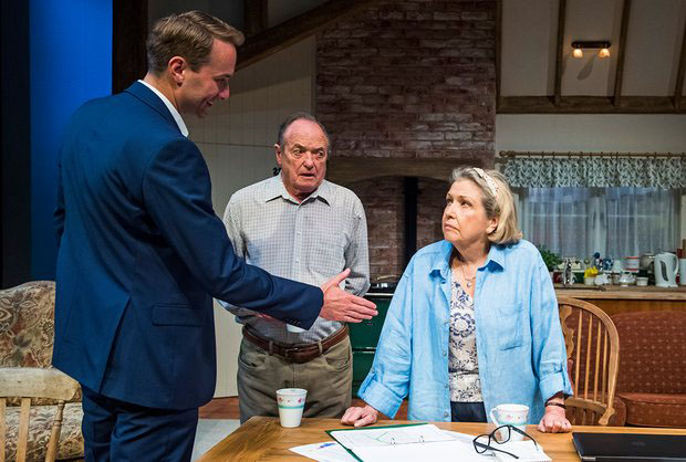 Then the revolve is Elizabeth and Jack’s timbered ceiling cottage kitchen with dark green Aga, tiled wall, comfy sofa and chair. The two sets revolve frequently with voice overs and video screens covering the revolve, during which furniture in front of the revolve is constantly set and reset … rather like First Light in the same theatre, a triumph of stage management.