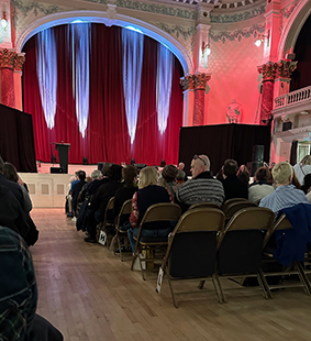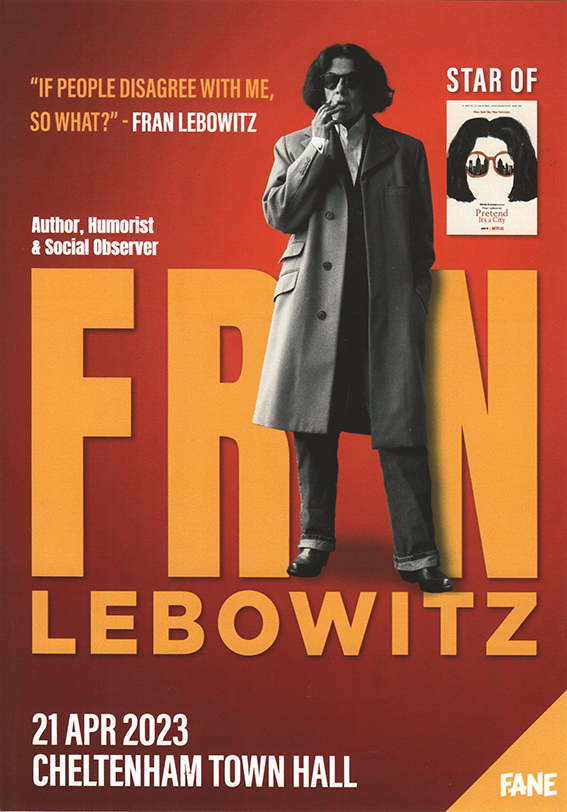 It’s a familiar location. We like Cheltenham. Karen used to stay with her granny here and went to primary school here for a few months between Belfast and Bournemouth. We’ve been to several Cheltenham Literary Festivals in this hall. We were keen to see Fran Lebowitz on her UK speaking tour. She’s 72, she knew Andy Warhol, she was part of the New York art scene. She’s renowned as an acerbic commentator and humorist.