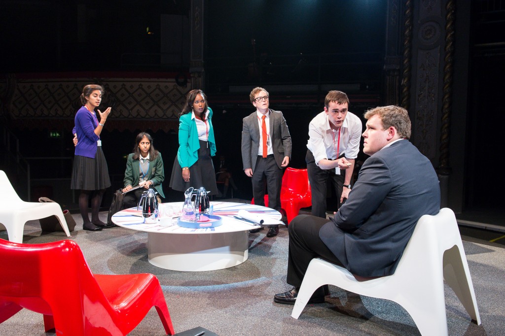 The last strand is a committee discussing educational policy. This is in a setting with smart red, white and blue plastic chairs and a round coffee table. They sit in different seats each time, which means that in the round we get a chance to see each of them well.