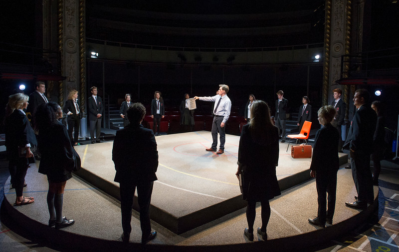 The play has a large cast, sometimes playing a chorus of schoolkids in blue uniforms. It opens with everyone standing in a circle around the stage in blue blazers playing recorders. It is played in the round.