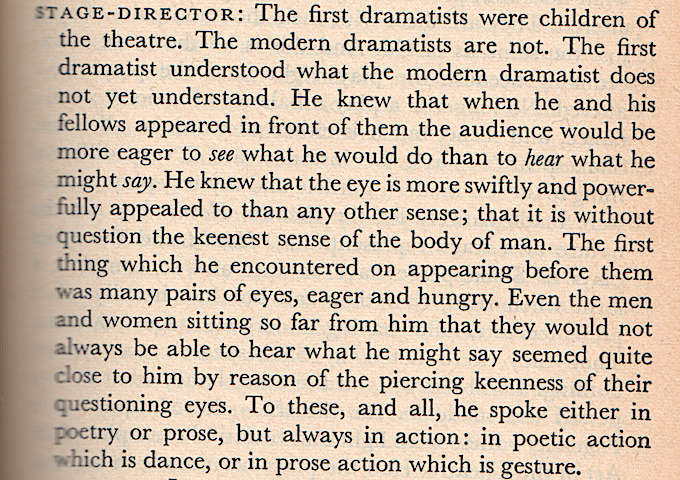 Edward Gordon Craig featured in the production course at university, though Irving and Terry didn’t appear at all. Craig was innovative on stage lighting (from above rather than footlights), moveable flats, non-realistic sets, costume, dance and movement. I’ll add that the stage lighting here in Bath was exemplary, as were the projected digital backgrounds. Edward Gordon Craig is a figure of fun in the play, stressing the aspect that he preferred designing and conceiving a play to actually doing one. I empathize. I much prefer writing books to promoting them. I went to the shelves to see what I had on Craig. The first book I picked up was Eric Bentley’s The Theory of The Modern Stage. One page was turned over. It was an extract from Craig: