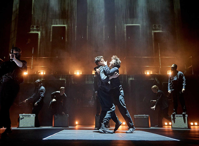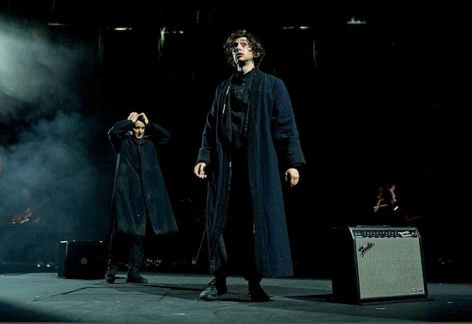 The movement is angular, stark, enhanced by the music, and in particular a great drummer in Shane Forbes. The programme notes that one inspiration was Egon Schiele’s art with distorted figures. Claudius and Gertrude are cast tall to emphasize that. Polonius fits the pattern too. Looking at the cast bios, it’s hard to believe their general background is acting, not dance centred musicals. They use Fender guitar amplifiers as temporary platforms throughout and shift them around.
