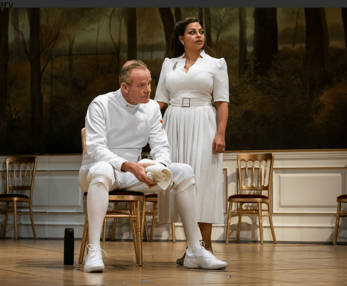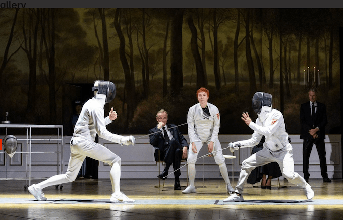 The ending continues the fencing as a sport motif (which echoes the RSC production with Jonathan Slinger). The fight is well done and effective though unspectacular, and the pressing cut hands together spreading the venom is good. We’ll ignore the great advantage given to longer arms. Whether Laertes should assist Hamlet versus Claudius is a moot point.