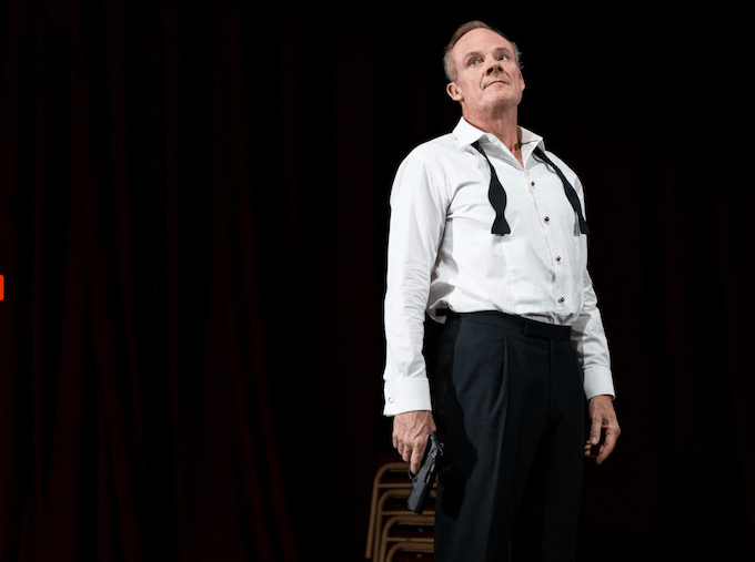 The interval cut comes after Claudius’ confession / prayer (Act 3 Scene 3), then opens the scond part instantly on the Hamlet / Gertrude scene (Act 3 Scene 4), which is not in a bedroom but in the main hall as theatre, with the chairs stacked. I didn’t like the death of Polonius.