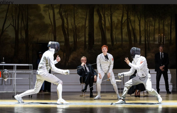 The ending continues the fencing as a sport motif (which echoes the RSC production with Jonathan Slinger). The fight is well done and effective though unspectacular, and the pressing cut hands together spreading the venom is good. We’ll ignore the great advantage given to longer arms. Whether Laertes should assist Hamlet versus Claudius is a moot point.