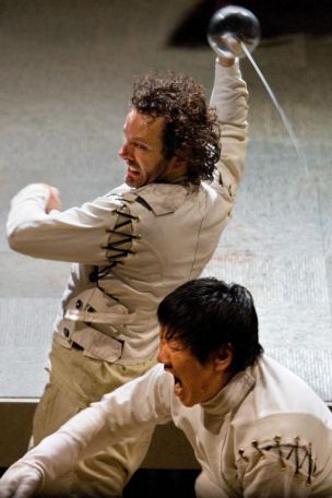 Michael Sheen with Benedict Wong (Laertes) … conveniently in the sand pit