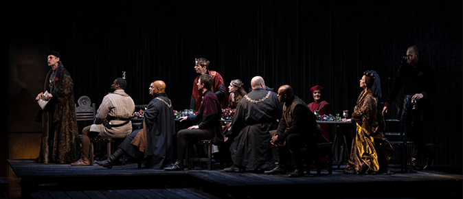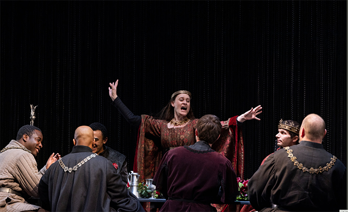 Henry VI – Rebellion is an odd production veering on bizarre and misguided in several interpretations. They have cut Sussex’s opening speech entirely, which loses the back story about him going to France to secure Margaret as his princess, wedding her by proxy and accompanying her back. It makes a more dramatic start at the feast to celebrate her arrival, but at the loss of building the romance with Sussex. It doesn’t come out until later, but it should have been built in from the outset.