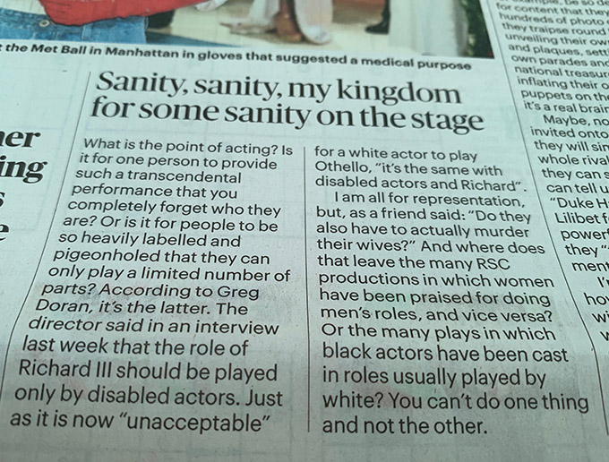 Apart from the Richard III’s society’s defence of the last Yorkist monarch, it is recorded that Richard III was a mighty warrior in combat. Hunchbacked he may have been, but he was a powerful physical presence.The logical conclusion of the ‘only black actors can play Othello‘ argument, would be that only white actors should be playing the medieval dukes of England, which is not happening here. Not that I think it should be, and Trevor Nunn was lambasted for casting white actors as white nobles in his Rose, Kingston production of John Barton and Peter Hall’s adaptation as Wars Of The Roses, as well as casting male actors as male characters in the story, which again, is not entirely happening here. I’m afraid Gregory Doran’s argument is paper thin. Followed to any kind of conclusion, it would be ridiculous to have women playing male roles. Henry VI Parts 2 and Part 3 are about males fighting in a male dominated world.